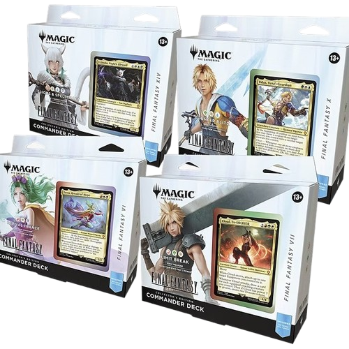 En Commander, cuatro jugadores se reúnen para demostrar su fuerza y sus dotes estratégicas... y solo una persona puede alzarse con la victoria. Los mazos de Commander de edición de coleccionista de 100 cartas de Magic: The Gathering—FINAL FANTASY están listos para usar.